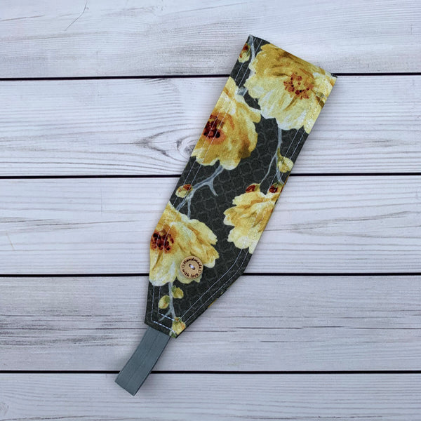 Our handmade buttoned headband is intended for use with face masks to help alleviate ear pain from constantly wearing a mask. It is ideal for our nurses, health care providers and those whom need to be in public wearing a face mask for extended periods of time. The elastic from a mask wraps around the button on either side of the headband to keep it off your ears. Each headband is made from two layers of cotton with in between is a layer of interfacing. The elastic across a gap in the back to help with a more comfortable fit. Each headband is washable and reusable.