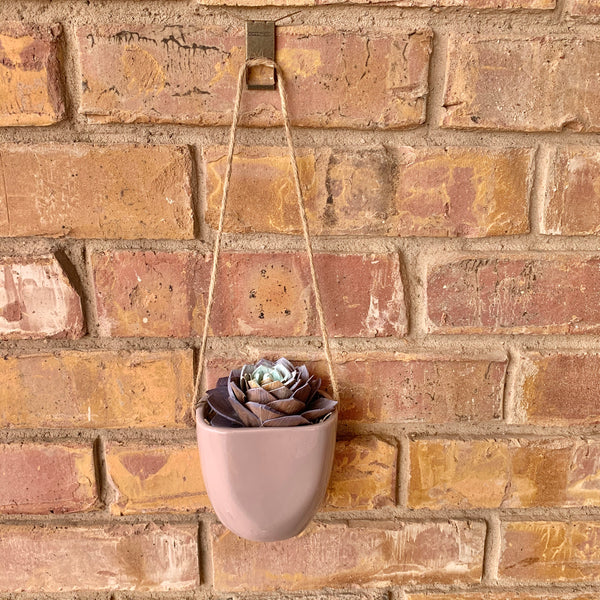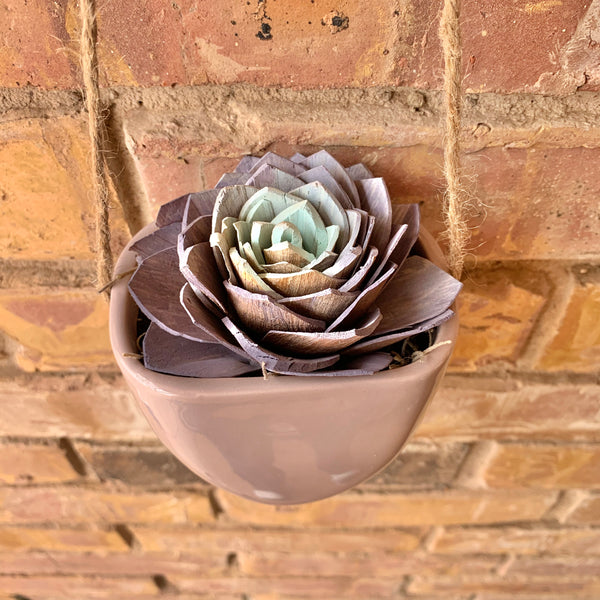 This handmade wood succulent looks so pretty in the ceramic vase! The natural wood base is a great added touch too. It can be hung from the twine rope or set on a desktop if needed.