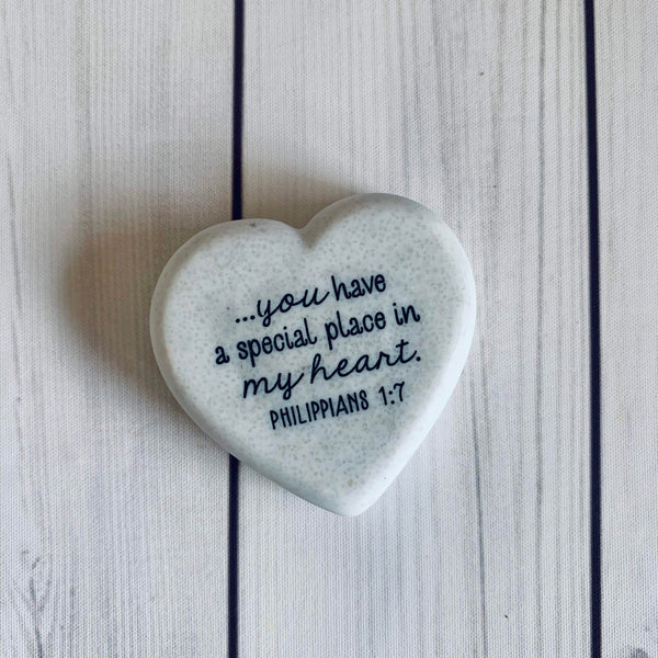 Heart cast stone with a natural rustic feel features a scripture verse engraved onto the heart. It is Ideal for shelf, desk, or table display. "..you have a special place in my heart. Philippians 1:7"